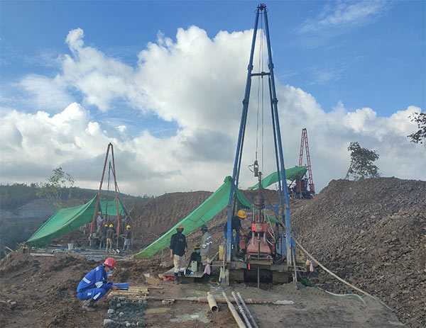 人心齊,泰山移。在疫情最為嚴峻的7月,印尼公司經(jīng)理帶著院領導的囑托親臨現(xiàn)場指導工作,統(tǒng)籌全局,克服多方面困難,全力保證項目各項投入和正常運行。由于勘察區(qū)域地處礦區(qū),從園區(qū)駐地到礦區(qū)每天往返至少需要兩個半小時,為了減少路途耗時,項目部經(jīng)多次和業(yè)主溝通,主動要求搬入尚未通水通電的現(xiàn)場臨建板房,以此減少通勤時間,加快施工進度。在印尼入境難、中方作業(yè)人員嚴重不足的情況下,主動選拔培養(yǎng)當?shù)厝藛T操作鉆機,儲備操作能手,為后續(xù)人員輪崗和降低成本打下基礎。施工期間正值當?shù)赜昙荆瑢υ忌降刂械囊巴庾鳂I(yè)影響尤為明顯,持續(xù)性強降雨導致山間臨建土路泥濘不堪,鉆機設備和運輸車輛通行艱難,損耗增高,各機臺每日所需物質(zhì),小到一把扳手,大到柴油機和水泵,通過人扛肩挑,一點點背上山去。由于項目用地涉及壓礦,需要等待露天紅土鎳礦開采完成以后才可以施工勘察孔,使得諸多外業(yè)工作與采礦作業(yè)以“打游擊戰(zhàn)”的方式完成,這也導致了很多區(qū)塊多次進場,增加了施工難度。該勘察項目的階段性勝利為下一階段施工打下了良好的基礎,也為業(yè)主單位施工圖紙設計爭取了寶貴時間,得到了業(yè)主的一致好評。