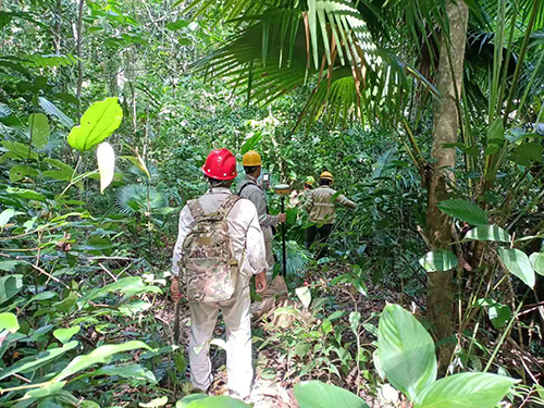 該項目是印尼公司今年首個探礦項目,大部分鉆孔位于原始森林地區,勘探線路總長9公里,無進場道路,施工難度較大。項目部發揚“逢山開路、遇水搭橋”的奮斗精神,敢于擔當,攻堅克難,用心用力解決森林放孔、鉆機用水、交通等難題。因施工現場地形起伏較大,山林中溝谷縱橫,樹林茂密,采用全站儀效率極低,GPS信號時有時無。項目部決定先讓工人用砍刀修出小道,然后攜帶GPS等測量設備進入森林地區,測放出大致孔位后安排挖機修路,最后再精確定位。印尼當地氣候高溫炎熱,森林中蚊蟲肆虐,密不透風,手機無信號,時不時還有小動物出沒,踏勘人員需要時時刻刻提高警惕,這對踏勘組人員體能及意志力是一個極大的考驗。為了提高工作效率,項目人員攜帶干糧進山,中午稍作休息補充能量,便繼續向森林深處進發。每到達一個新的孔位,對于踏勘人員來說就是一次勝利。由于現場踏勘時沒有在森林中找到水源。通過跟業主協商,從最近的供水管道引水,鉆孔間直線距離大于200米,單線最大供水長度約3.5公里。項目部便采用方桶裝滿水后,讓挖機一桶一桶吊進去,或從路邊挖水坑,用抽水泵一站一站倒過去。項目人員上下班時,皮卡車僅能將他們送到山腳下,剩下的路程只能靠他們徒步前行,他們卻從未喊過苦、叫過累。